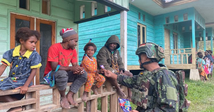INTAN JAYA - Suasana hangat dan penuh keceriaan mewarnai Kampung Bilai, Distrik setempat, Kabupaten Intan Jaya, Papua Tengah, saat personel Pos Bilai Satgas Pamtas RI–PNG Mobile Yonif 113/Jaya Sakti membagikan permen kepada anak-anak, Rabu (22/4/2026).