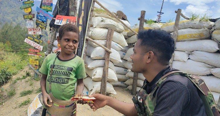 INTAN JAYA - Kehangatan dan keceriaan terpancar dari wajah anak-anak Kampung Maya saat personel Satgas Pamtas RI–PNG Mobile Yonif 113/Jaya Sakti membagikan cokelat di sekitar Pos Maya, Kabupaten Intan Jaya, Papua Tengah, Minggu (19/4/2026).